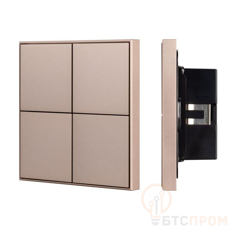 Универсальная многофункциональная встраиваемая настенная панель для систем KNX. 4 рокерные клавиши, 1 клавиша может выполнять функции 2-х клавиш. Тонкая рамка, материал - алюминий, отклик вибрацией, светодиодная индикация. Цвет корпуса - шампань (золото). Питание от шины KNX DC 21-30V. Габариты 86x86x33 мм. Под заказ от 10 штук.