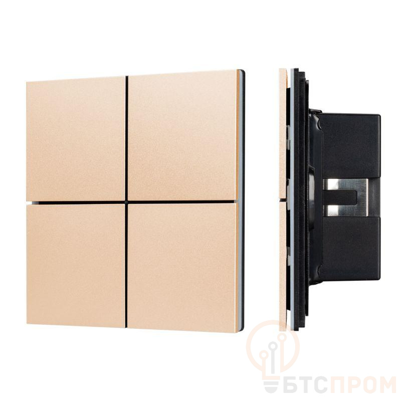 Универсальная многофункциональная встраиваемая настенная панель для систем KNX. 4 рокерные клавиши, 1 клавиша может выполнять функции 2-х клавиш. Безрамочный корпус, материал - алюминий, отклик вибрацией, светодиодная индикация. Цвет корпуса - шампань (золото). Питание от шины KNX DC 21-30V. Габариты 86x86x33 мм. Под заказ от 10 штук.