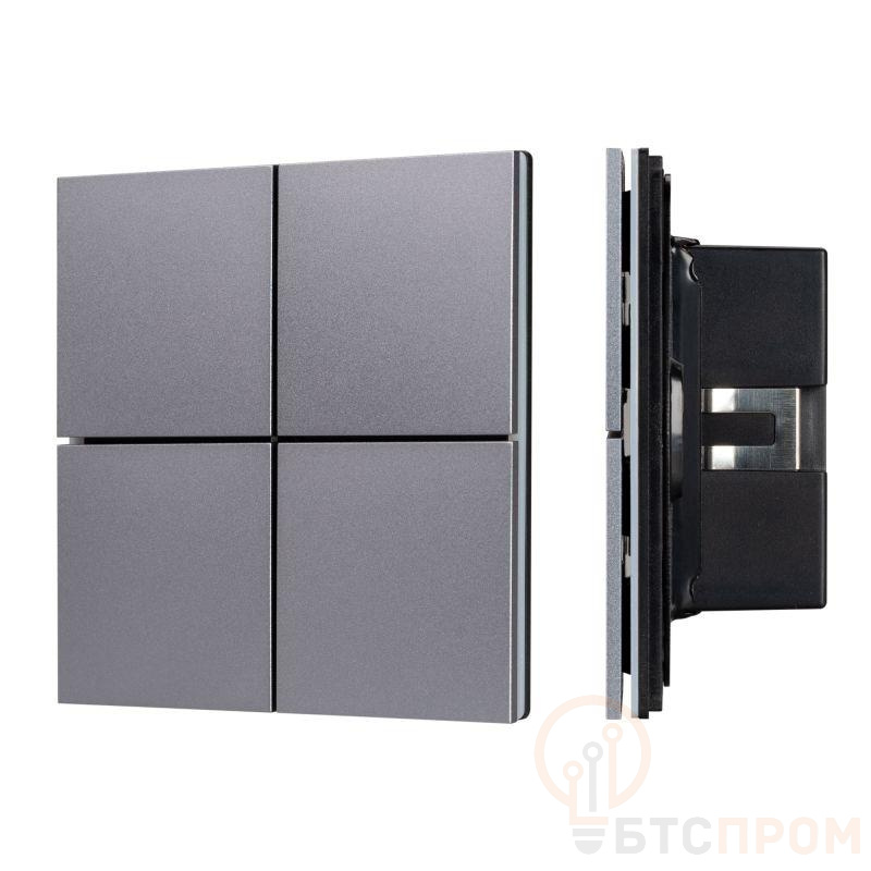 Универсальная многофункциональная встраиваемая настенная панель для систем KNX. 4 рокерные клавиши, 1 клавиша может выполнять функции 2-х клавиш. Безрамочный корпус, материал - алюминий, отклик вибрацией, светодиодная индикация. Цвет корпуса - серый. Питание от шины KNX DC 21-30V. Габариты 86x86x33 мм.