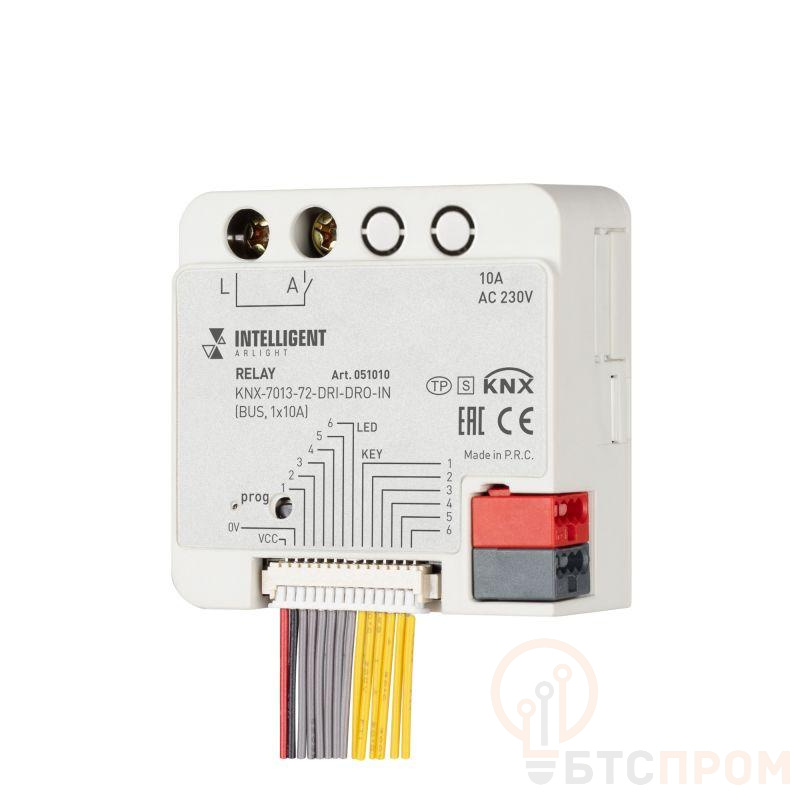 Релейный модуль KNX 1 канал по 10А, 6 входов типа "сухой контакт" - для любых типов панелей, датчиков и т.п.6 выходов на индикаторы 1 мА. Установка в подрозетник. Питание DC 21-30V от шины данных. Напряжение нагрузки 230V. Размер 50x50х22.8 мм.