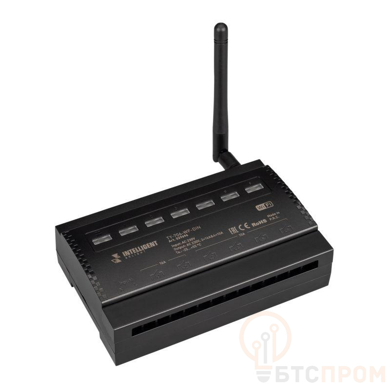 Релейный модуль 6-ти канальный для включения и выключения любой нагрузки (источники света, вентиляторы, приводы, бытовая техника и т.п.) управляемых по 230в. 2 канала по 16A + 4 канала по 10А на резистивной нагрузке. Совместим с RF панелями TY-228-*-RF. Имеет возможность полноценной работы в режиме SLAVE по MODBUS RTU. Напряжение питания 230В. Выход - сухие контакты реле. Монтаж на DIN-рейку. Управление через WI-FI 2.4ГГц.Управляется панелями серии KINETIC, совместим с платформой TUYA, и АЛИСА от ЯНДЕКС. Управление со смартфона через приложение INTELLIGENT ARLIGHT. Габариты модуля 125x80x34