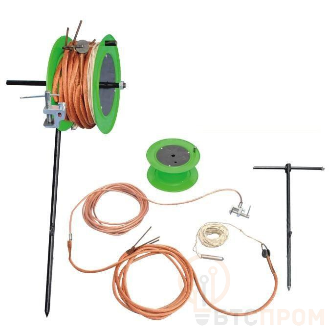 Заземление переносное (наброс) на провода ВЛ до 10 кВ. Предназначено для экстренного отключения воздушных линий электропередач посредством наброса на провода гибкого неизолированного медного провода и создания короткого замыкания между поводами ВЛ и заземляющим проводником, соединенным с землёй с помощью заземляющего электрода.