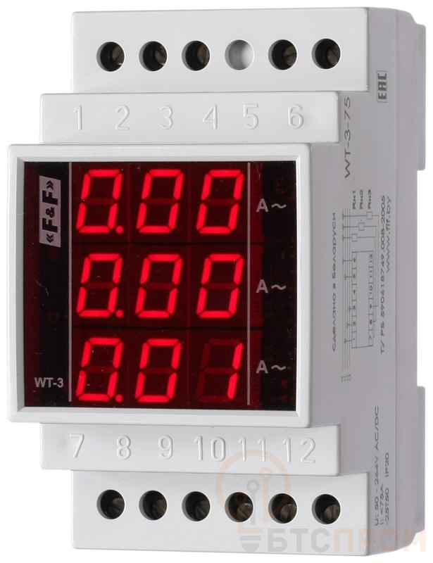 Указатель тока WT-3 (трехфазный; 0-20А; цифровая индикация; монтаж на DIN-рейке 35мм 50-264В AC/DC IP20) F&F EA04.008.006