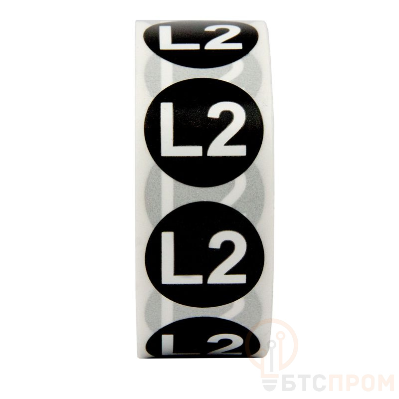 Маркеры для маркировки электрических шин для идентификации шин по фазам. Диаметр 20 мм, круг. Цвет - черный, символ - "L2" белого цвета. Материал - самоклеющаяся полимерная пленка. Температура эксплуатации от –40 до +90 °С. Упаковка - 500 шт.