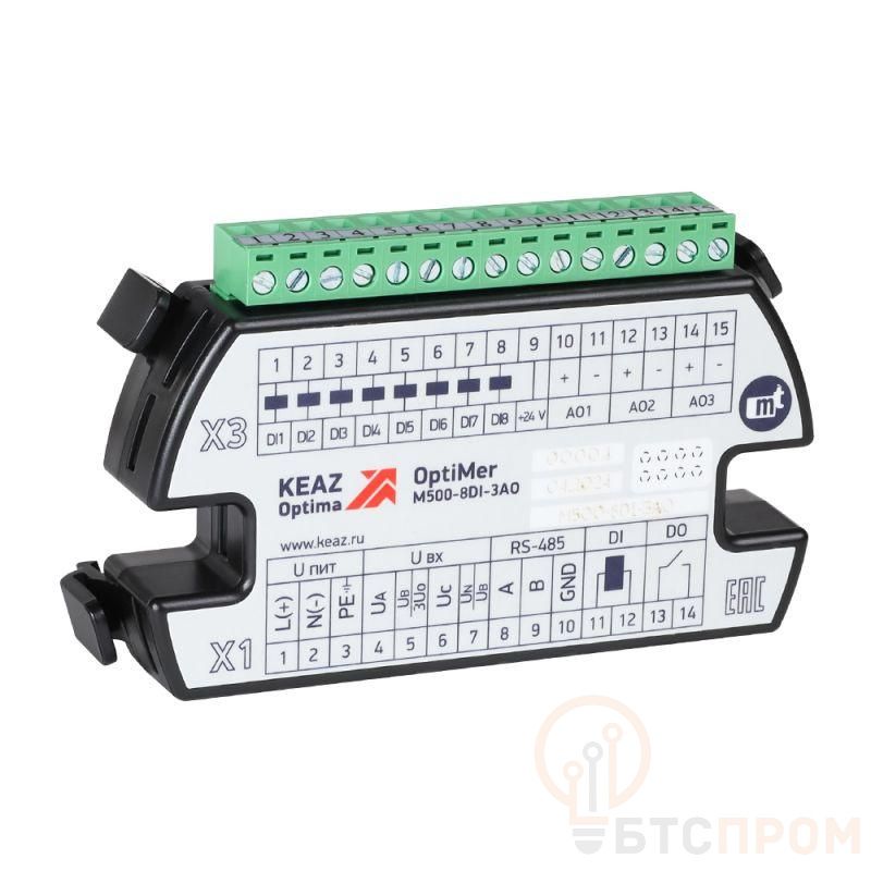 Модуль оснащен восьмью дискретными входами и тремя аналоговыми выходами. Дискретные входы типа "сухой контакт" не требуют использования внешнего источника питания. Для срабатывания входа достаточно замкнуть его контакт с общим контактом на клеммной колодке "Х3" модуля. Входы передают свои состояния по линии интерфейса RS-485 и Ethernet (при наличии модуля OptiMer-M500-ETH) в системы АСУ. Аналоговый выход преобразует измеряемый прибором сигнал в нормированный сигнал токовой петли 4…20 мA. Каждый аналоговый выход может быть привязан к одному измеряемому либо вычисляемому параметру.