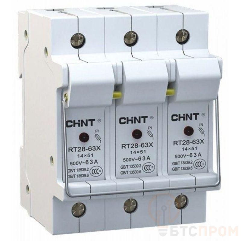Держатель плавких вставок RT28-63X 14х51 3П от ведущего производителя CHINT предназначен для безопасного монтажа и замены плавких вставок в электрических цепях. Модель с номинальным током 63А рассчитана на использование вставок габаритного размера 000 (14x51 мм). Трехполюсное исполнение (3П) позволяет одновременно управлять тремя независимыми цепями.