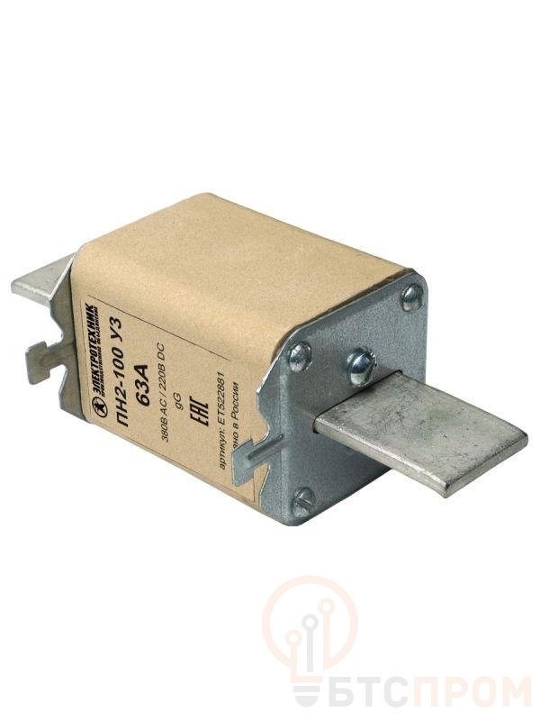 Предохранители плавкие промышленного назначения серии ПН2 предназначены для защиты электрооборудования промышленных установок и электрических сетей трёхфазного переменного тока с номинальным напряжением 380В частоты 50 и 60 Гц и с номинальным напряжением постоянного тока 220В включительно, при перегрузках и коротких замыканиях. * Конструкция контактной системы ножевого типа и болтового присоединения; * Применение механически прочных и неподдерживающих горение пластических материалов; * Токоведущие элементы из высококачественной электротехнической меди марки М1; * Плавкий элемент надежно соединен точечной сваркой с выводами предохранителя; * Плавкий элемент выполнен из электротехнической меди с нанесением напайки из олова, что позволяет обеспечить широкий диапазон защитной характеристики gG.