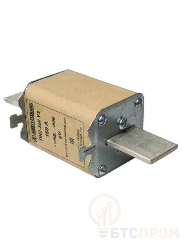 Предохранители плавкие промышленного назначения серии ПН2 предназначены для защиты электрооборудования промышленных установок и электрических сетей трёхфазного переменного тока с номинальным напряжением 380В частоты 50 и 60 Гц и с номинальным напряжением постоянного тока 220В включительно, при перегрузках и коротких замыканиях. * Конструкция контактной системы ножевого типа и болтового присоединения; * Применение механически прочных и неподдерживающих горение пластических материалов; * Токоведущие элементы из высококачественной электротехнической меди марки М1; * Плавкий элемент надежно соединен точечной сваркой с выводами предохранителя; * Плавкий элемент выполнен из электротехнической меди с нанесением напайки из олова, что позволяет обеспечить широкий диапазон защитной характеристики gG.