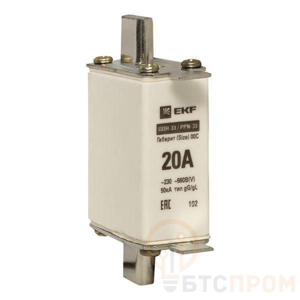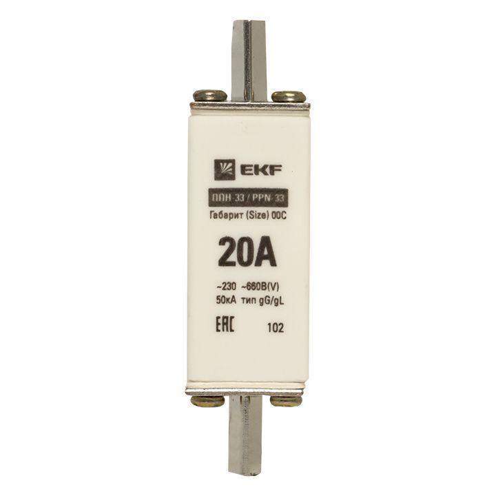 Плавкая вставка ППН-33 100/ 20А габарит 00С EKF. Предохранители плавкие ППН EKF, укомплектованные плавкими вставками типа gG/gL, предназначаются для защиты кабельных линий и промышленных электроустановок от токов перегрузки и короткого замыкания. Предохранители применяются в электрических сетях переменного тока частотой 50 Гц с напряжением до 660В. Применяются для крепления в распределительных и вводно-распределительных устройствах. Предохранители плавкие ППН могут устанавливаться в основание с держателем, а также в специально предназначенные рубильники. В комплект поставки предохранителей плавких ППН основание с держателем не входит и приобретается отдельно.