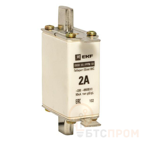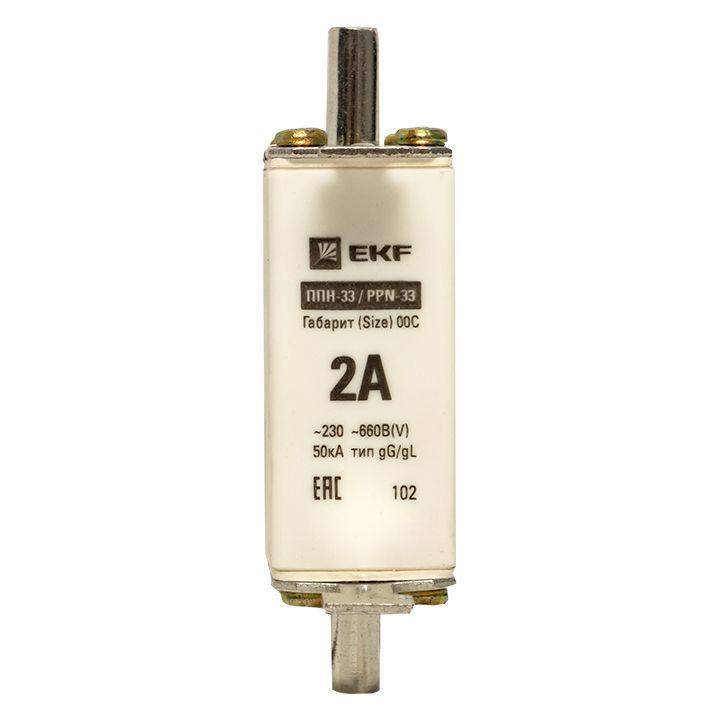 Плавкая вставка ППН-33 100/ 2А габарит 00С EKF. Предохранители плавкие ППН EKF, укомплектованные плавкими вставками типа gG/gL, предназначаются для защиты кабельных линий и промышленных электроустановок от токов перегрузки и короткого замыкания. Предохранители применяются в электрических сетях переменного тока частотой 50 Гц с напряжением до 660В. Применяются для крепления в распределительных и вводно-распределительных устройствах. Предохранители плавкие ППН могут устанавливаться в основание с держателем, а также в специально предназначенные рубильники. В комплект поставки предохранителей плавких ППН основание с держателем не входит и приобретается отдельно.
