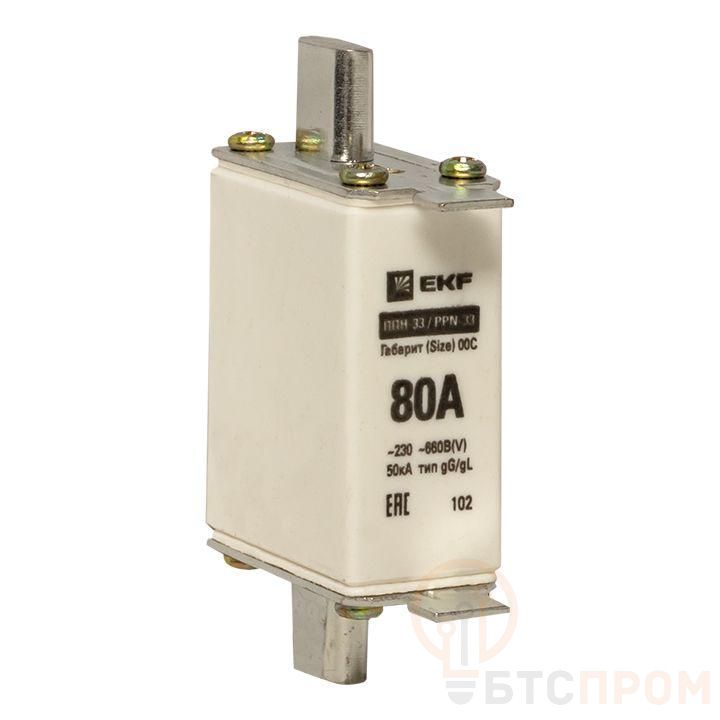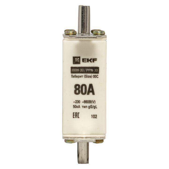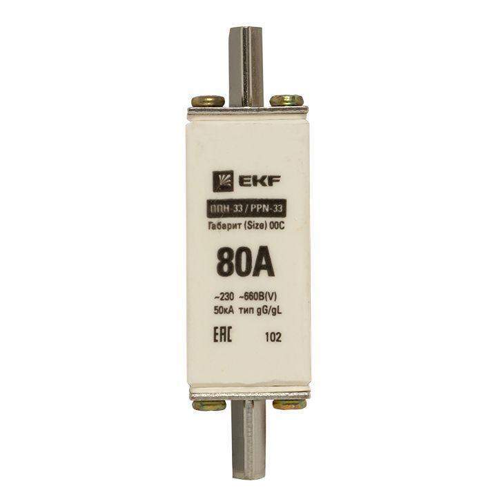 Плавкая вставка ППН-33 100/ 80А габарит 00С EKF. Предохранители плавкие ППН EKF, укомплектованные плавкими вставками типа gG/gL, предназначаются для защиты кабельных линий и промышленных электроустановок от токов перегрузки и короткого замыкания. Предохранители применяются в электрических сетях переменного тока частотой 50 Гц с напряжением до 660В. Применяются для крепления в распределительных и вводно-распределительных устройствах. Предохранители плавкие ППН могут устанавливаться в основание с держателем, а также в специально предназначенные рубильники. В комплект поставки предохранителей плавких ППН основание с держателем не входит и приобретается отдельно.