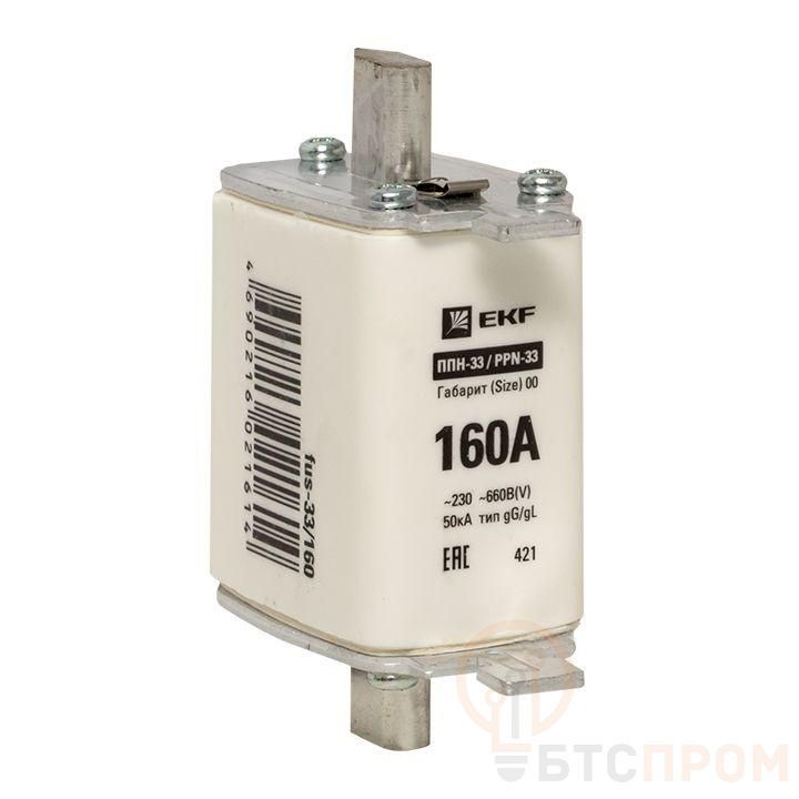 Плавкая вставка ППН-33 160/160А габарит 00 EKF. Предохранители плавкие ППН EKF, укомплектованные плавкими вставками типа gG/gL, предназначаются для защиты кабельных линий и промышленных электроустановок от токов перегрузки и короткого замыкания. Предохранители применяются в электрических сетях переменного тока частотой 50 Гц с напряжением до 660В. Применяются для крепления в распределительных и вводно-распределительных устройствах. Предохранители плавкие ППН могут устанавливаться в основание с держателем, а также в специально предназначенные рубильники. В комплект поставки предохранителей плавких ППН основание с держателем не входит и приобретается отдельно.