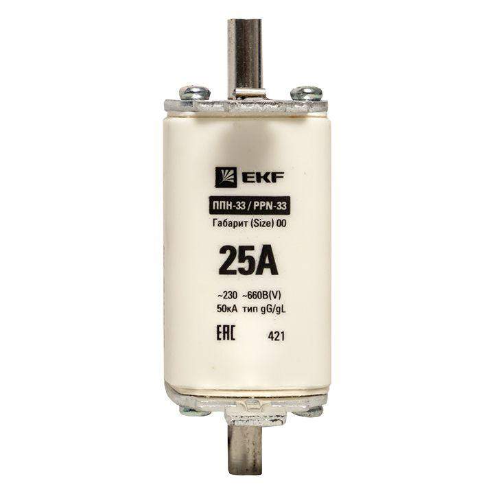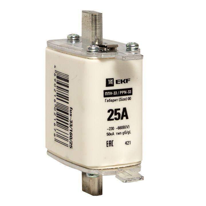 Плавкая вставка ППН-33 160/ 25А габарит 00 EKF. Предохранители плавкие ППН EKF, укомплектованные плавкими вставками типа gG/gL, предназначаются для защиты кабельных линий и промышленных электроустановок от токов перегрузки и короткого замыкания. Предохранители применяются в электрических сетях переменного тока частотой 50 Гц с напряжением до 660В. Применяются для крепления в распределительных и вводно-распределительных устройствах. Предохранители плавкие ППН могут устанавливаться в основание с держателем, а также в специально предназначенные рубильники. В комплект поставки предохранителей плавких ППН основание с держателем не входит и приобретается отдельно.