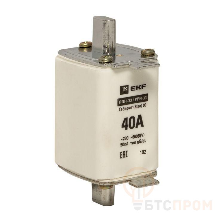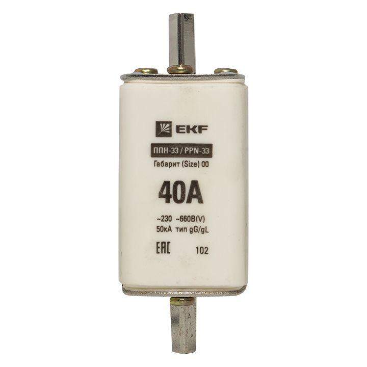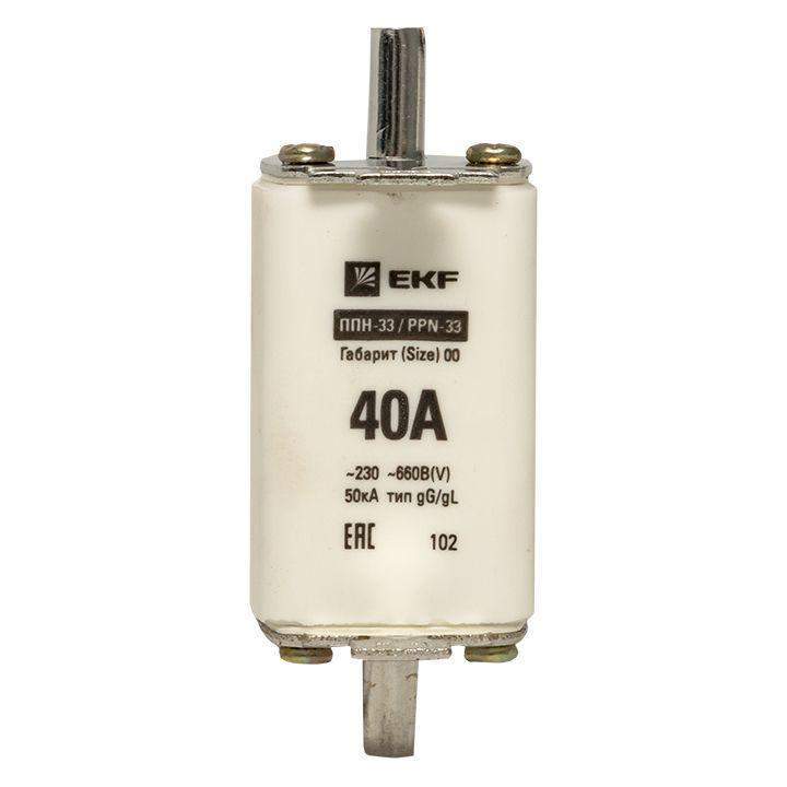 Плавкая вставка ППН-33 160/ 40А габарит 00 EKF. Предохранители плавкие ППН EKF, укомплектованные плавкими вставками типа gG/gL, предназначаются для защиты кабельных линий и промышленных электроустановок от токов перегрузки и короткого замыкания. Предохранители применяются в электрических сетях переменного тока частотой 50 Гц с напряжением до 660В. Применяются для крепления в распределительных и вводно-распределительных устройствах. Предохранители плавкие ППН могут устанавливаться в основание с держателем, а также в специально предназначенные рубильники. В комплект поставки предохранителей плавких ППН основание с держателем не входит и приобретается отдельно.