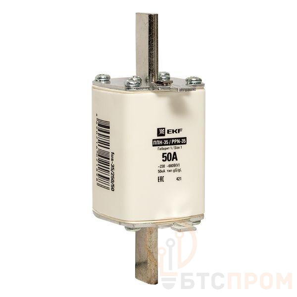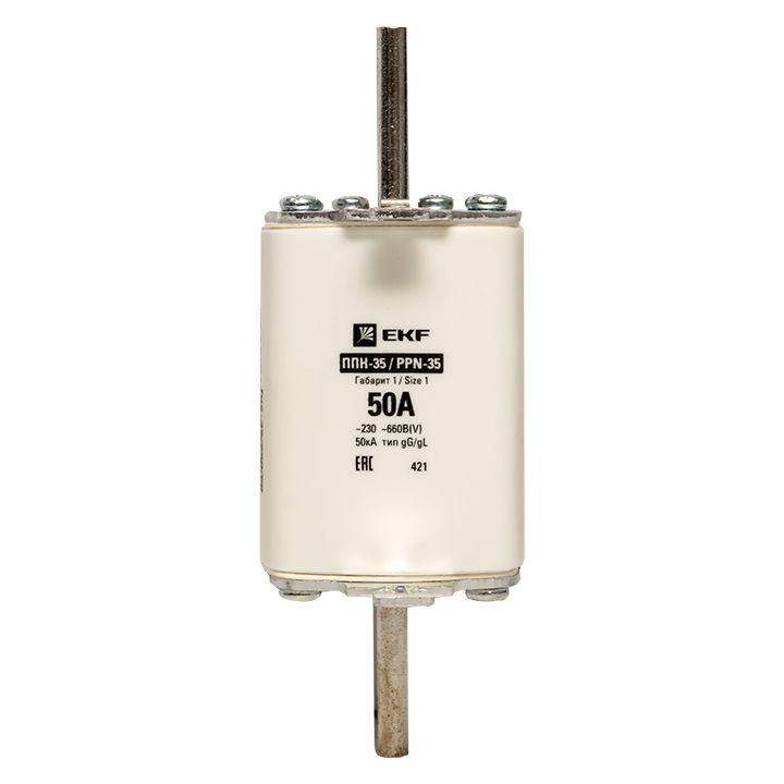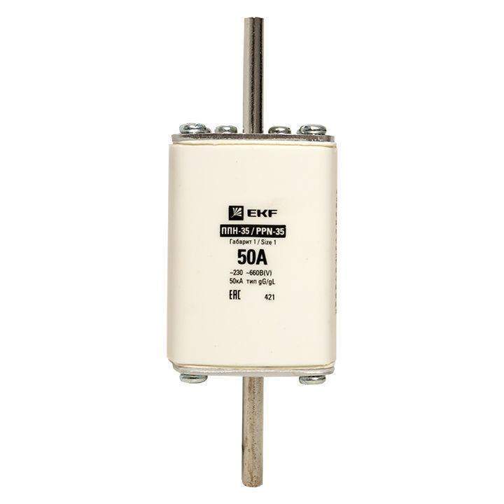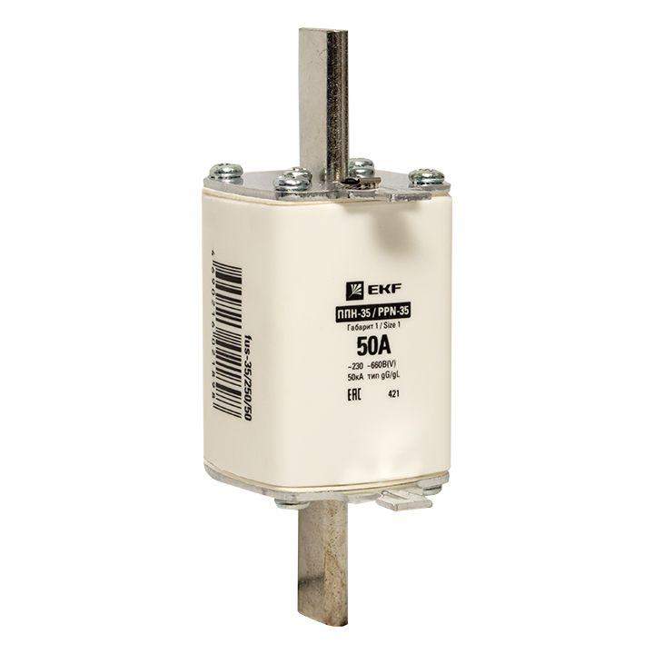 Плавкая вставка ППН-35 250/ 50А габарит 1 EKF. Предохранители плавкие ППН EKF, укомплектованные плавкими вставками типа gG/gL, предназначаются для защиты кабельных линий и промышленных электроустановок от токов перегрузки и короткого замыкания. Предохранители применяются в электрических сетях переменного тока частотой 50 Гц с напряжением до 660В. Применяются для крепления в распределительных и вводно-распределительных устройствах. Предохранители плавкие ППН могут устанавливаться в основание с держателем, а также в специально предназначенные рубильники. В комплект поставки предохранителей плавких ППН основание с держателем не входит и приобретается отдельно.