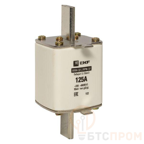 Плавкая вставка ППН-37 400/125А габарит 2 EKF. Предохранители плавкие ППН EKF, укомплектованные плавкими вставками типа gG/gL, предназначаются для защиты кабельных линий и промышленных электроустановок от токов перегрузки и короткого замыкания. Предохранители применяются в электрических сетях переменного тока частотой 50 Гц с напряжением до 660В. Применяются для крепления в распределительных и вводно-распределительных устройствах. Предохранители плавкие ППН могут устанавливаться в основание с держателем, а также в специально предназначенные рубильники. В комплект поставки предохранителей плавких ППН основание с держателем не входит и приобретается отдельно.