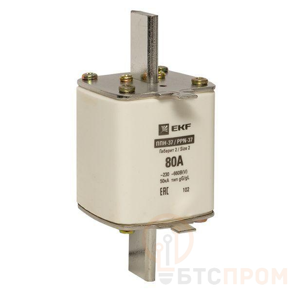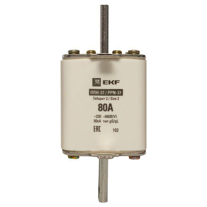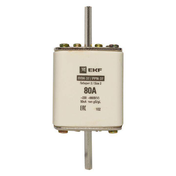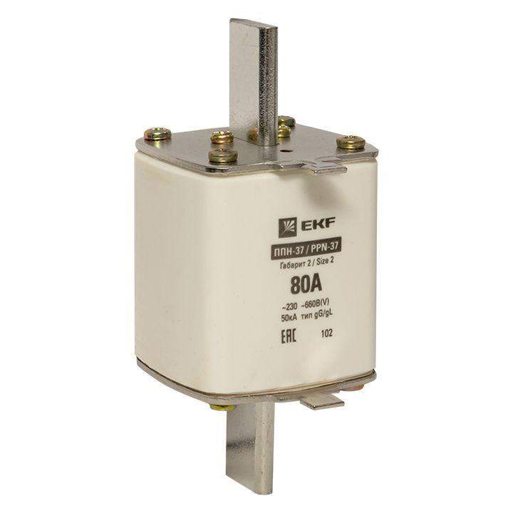 Плавкая вставка ППН-37 400/80А габарит 2 EKF. Предохранители плавкие ППН EKF, укомплектованные плавкими вставками типа gG/gL, предназначаются для защиты кабельных линий и промышленных электроустановок от токов перегрузки и короткого замыкания. Предохранители применяются в электрических сетях переменного тока частотой 50 Гц с напряжением до 660В. Применяются для крепления в распределительных и вводно-распределительных устройствах. Предохранители плавкие ППН могут устанавливаться в основание с держателем, а также в специально предназначенные рубильники. В комплект поставки предохранителей плавких ППН основание с держателем не входит и приобретается отдельно.