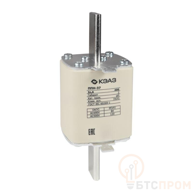 Предохранитель ножевого типа на номинальный ток 63 А, габаритом 2 и потерями мощности 6.5 Вт.