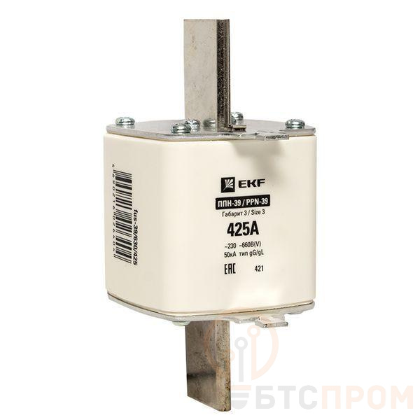 Плавкая вставка ППН-39 630/425А габарит 3 EKF. Предохранители плавкие ППН EKF, укомплектованные плавкими вставками типа gG/gL, предназначаются для защиты кабельных линий и промышленных электроустановок от токов перегрузки и короткого замыкания. Предохранители применяются в электрических сетях переменного тока частотой 50 Гц с напряжением до 660В. Применяются для крепления в распределительных и вводно-распределительных устройствах. Предохранители плавкие ППН могут устанавливаться в основание с держателем, а также в специально предназначенные рубильники. В комплект поставки предохранителей плавких ППН основание с держателем не входит и приобретается отдельно.