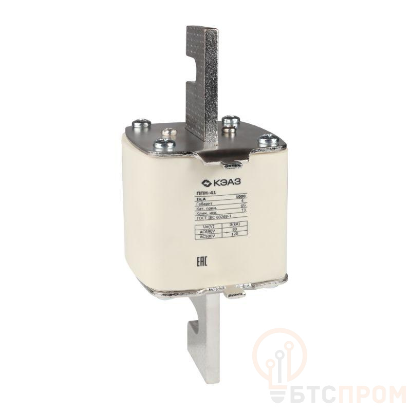 Предохранитель ножевого типа на номинальный ток 630 А, габаритом 4 и потерями мощности 48 Вт.