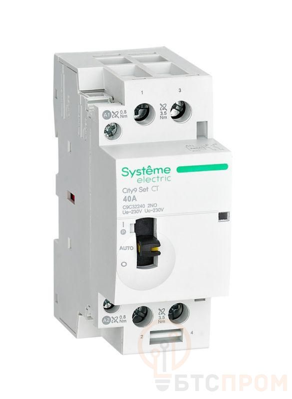 Контактор CT серии City9 Set Systeme Electric на номинальный ток 40 А (AC7a / AC7b), 2НО, номинальное напряжение силовой цепи - 230В, напряжение цепи управления - 230В, ширина 36 мм.- В сочетании с автоматическими выключателями или АВДТ обеспечивают дистанционное управление в однофазных и трехфазных цепях переменного тока (освещение, отопление, вентиляция, жалюзи и т.п.)- Управление неприоритетными нагрузками с помощью мастер-выключателя.- Механический индикатор положения контактов. - Крепление защёлкиванием на DIN-рейке шириной 35 мм.
