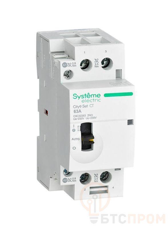 Контактор CT серии City9 Set Systeme Electric на номинальный ток 63 А (AC7a / AC7b), 2НО, номинальное напряжение силовой цепи - 230В, напряжение цепи управления - 230В, ширина 36 мм.- В сочетании с автоматическими выключателями или АВДТ обеспечивают дистанционное управление в однофазных и трехфазных цепях переменного тока (освещение, отопление, вентиляция, жалюзи и т.п.)- Управление неприоритетными нагрузками с помощью мастер-выключателя.- Механический индикатор положения контактов. - Крепление защёлкиванием на DIN-рейке шириной 35 мм.