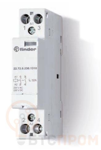 Контактор модульный FINDER 22.72 — это надежный двухполюсный коммутационный аппарат с нормально замкнутыми контактами (2NC), предназначенный для установки на DIN-рейку. Устройство рассчитано на номинальный ток 32 А и рабочее напряжение до 240 В переменного или постоянного тока, что обеспечивает универсальность применения.