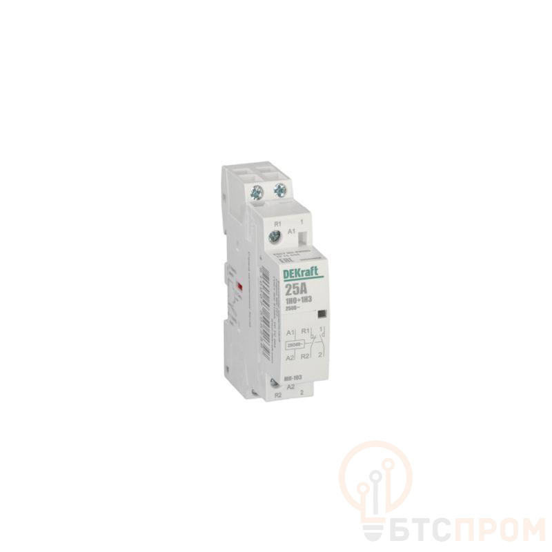 Модульный контактор серии МК-103 Dekraft; ном.ток 25 А (АС-7а); кол-во и исполнение контактов – 1НО+1НЗ; напряжение управления 220 В пер.тока; ширина – 1 мод. х 18 мм; установка – на DIN-рейку. Контакторы МК-103 применяются в сетях напряжением до 400 В пер.тока для дистанционного управления небольшими нагрузками, требующими большого количества включений / отключений, например, насосы, системы вентиляции и т.п. Модульные контакторы не требуют дополнительных настроек и специального обслуживания.