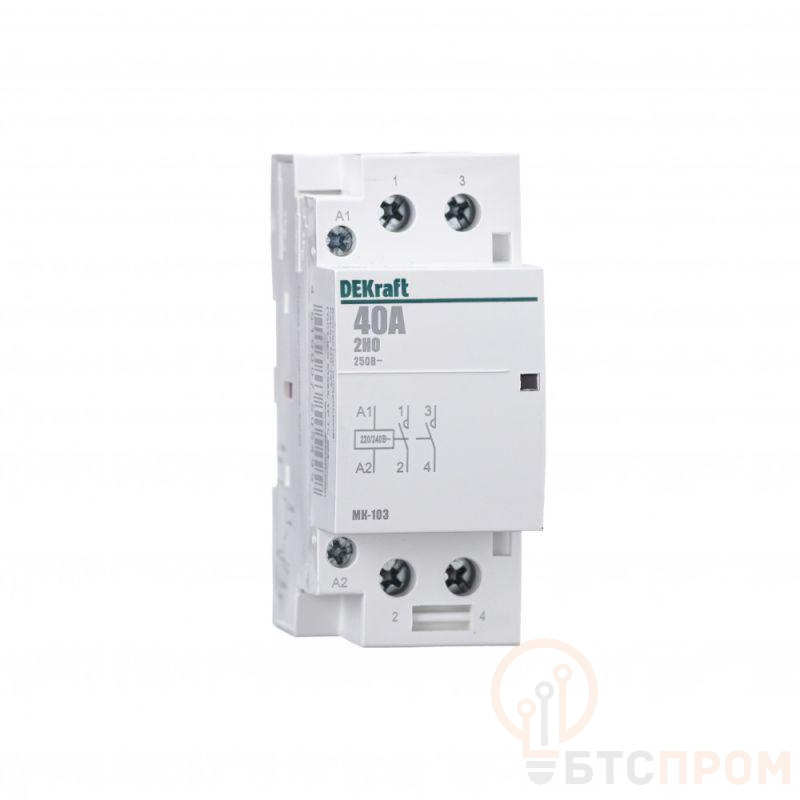 Модульный контактор серии МК-103 Dekraft; ном.ток 40 А (АС-7а); кол-во и исполнение контактов – 2НО; напряжение управления 220 В пер.тока; ширина – 2 мод. х 18 мм; установка – на DIN-рейку. Контакторы МК-103 применяются в сетях напряжением до 400 В пер.тока для дистанционного управления небольшими нагрузками, требующими большого количества включений / отключений, например, насосы, системы вентиляции и т.п. Модульные контакторы не требуют дополнительных настроек и специального обслуживания.