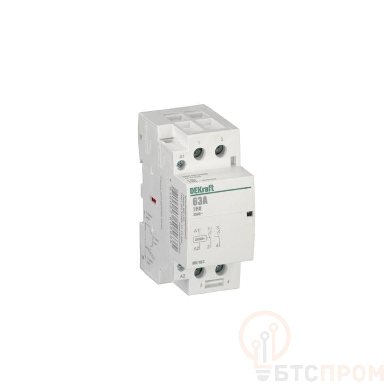 Модульный контактор серии МК-103 Dekraft; ном.ток 63 А (АС-7а); кол-во и исполнение контактов – 2НО; напряжение управления 220 В пер.тока; ширина – 3 мод. х 18 мм; установка – на DIN-рейку. Контакторы МК-103 применяются в сетях напряжением до 400 В пер.тока для дистанционного управления небольшими нагрузками, требующими большого количества включений / отключений, например, насосы, системы вентиляции и т.п. Модульные контакторы не требуют дополнительных настроек и специального обслуживания.