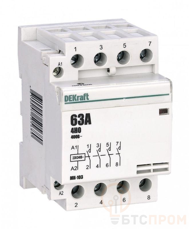 Модульный контактор серии МК-103 Dekraft; ном.ток 32 А (АС-7а); кол-во и исполнение контактов – 4НО; напряжение управления 220 В пер.тока; ширина – 3 мод. х 18 мм; установка – на DIN-рейку. Контакторы МК-103 применяются в сетях напряжением до 400 В пер.тока для дистанционного управления небольшими нагрузками, требующими большого количества включений / отключений, например, насосы, системы вентиляции и т.п. Модульные контакторы не требуют дополнительных настроек и специального обслуживания.