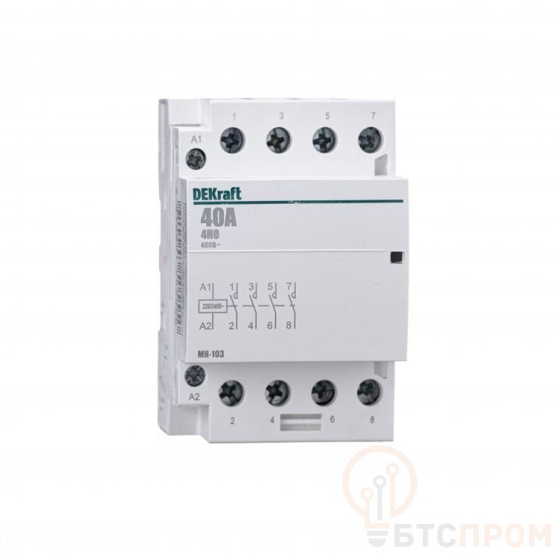 Модульный контактор серии МК-103 Dekraft; ном.ток 40 А (АС-7а); кол-во и исполнение контактов – 4НО; напряжение управления 220 В пер.тока; ширина – 3 мод. х 18 мм; установка – на DIN-рейку. Контакторы МК-103 применяются в сетях напряжением до 400 В пер.тока для дистанционного управления небольшими нагрузками, требующими большого количества включений / отключений, например, насосы, системы вентиляции и т.п. Модульные контакторы не требуют дополнительных настроек и специального обслуживания.