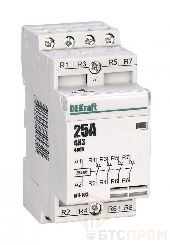 Модульный контактор серии МК-103 Dekraft; ном.ток 16 А (АС-7а); кол-во и исполнение контактов – 4НЗ; напряжение управления 220 В пер.тока; ширина – 2 мод. х 18 мм; установка – на DIN-рейку. Контакторы МК-103 применяются в сетях напряжением до 400 В пер.тока для дистанционного управления небольшими нагрузками, требующими большого количества включений / отключений, например, насосы, системы вентиляции и т.п. Модульные контакторы не требуют дополнительных настроек и специального обслуживания.