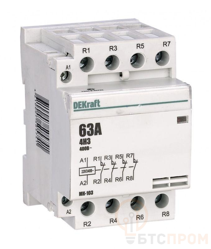 Модульный контактор серии МК-103 Dekraft; ном.ток 63 А (АС-7а); кол-во и исполнение контактов – 4НЗ; напряжение управления 220 В пер.тока; ширина – 3 мод. х 18 мм; установка – на DIN-рейку. Контакторы МК-103 применяются в сетях напряжением до 400 В пер.тока для дистанционного управления небольшими нагрузками, требующими большого количества включений / отключений, например, насосы, системы вентиляции и т.п. Модульные контакторы не требуют дополнительных настроек и специального обслуживания.