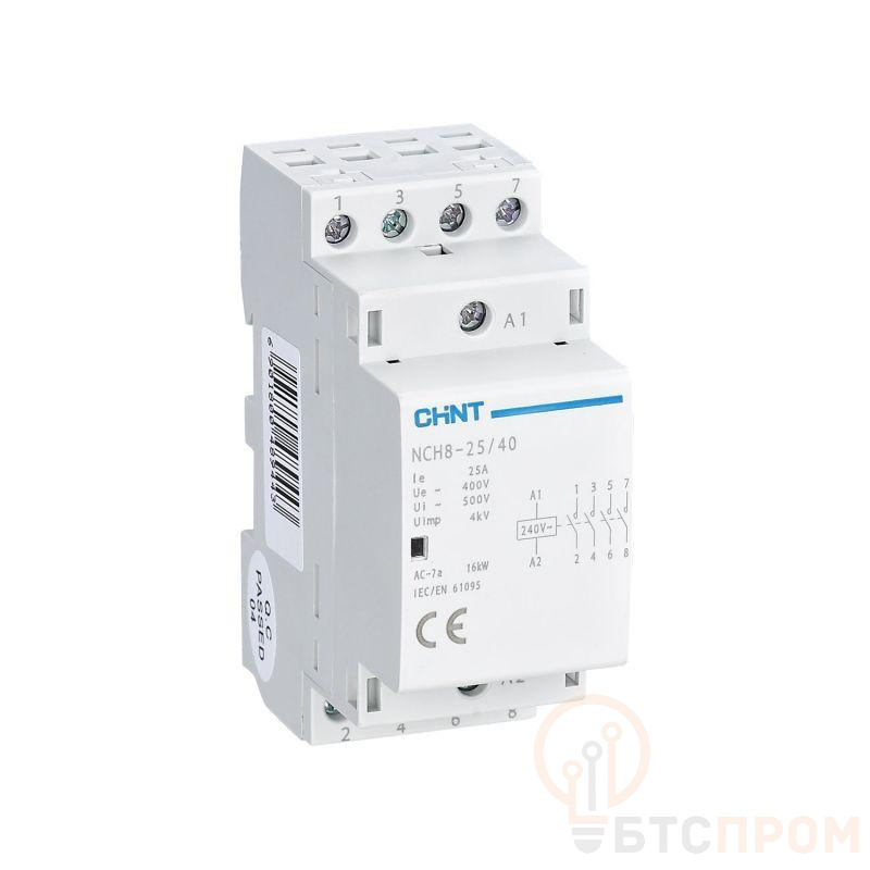 Модульный контактор NCH8-25/40 от бренда CHINT — это компактное и надежное устройство, предназначенное для дистанционного управления и коммутации электрических цепей. Аппарат рассчитан на номинальный ток 25 А и оснащен четырьмя нормально разомкнутыми (4НО) контактами, что позволяет одновременно управлять несколькими независимыми линиями.