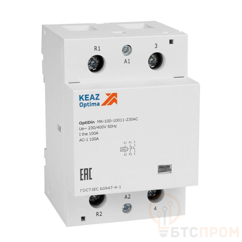 Модульный контактор на номинальный ток 100 А габаритом 3 модуля с контактной группой 1 НО, 1 НЗ .