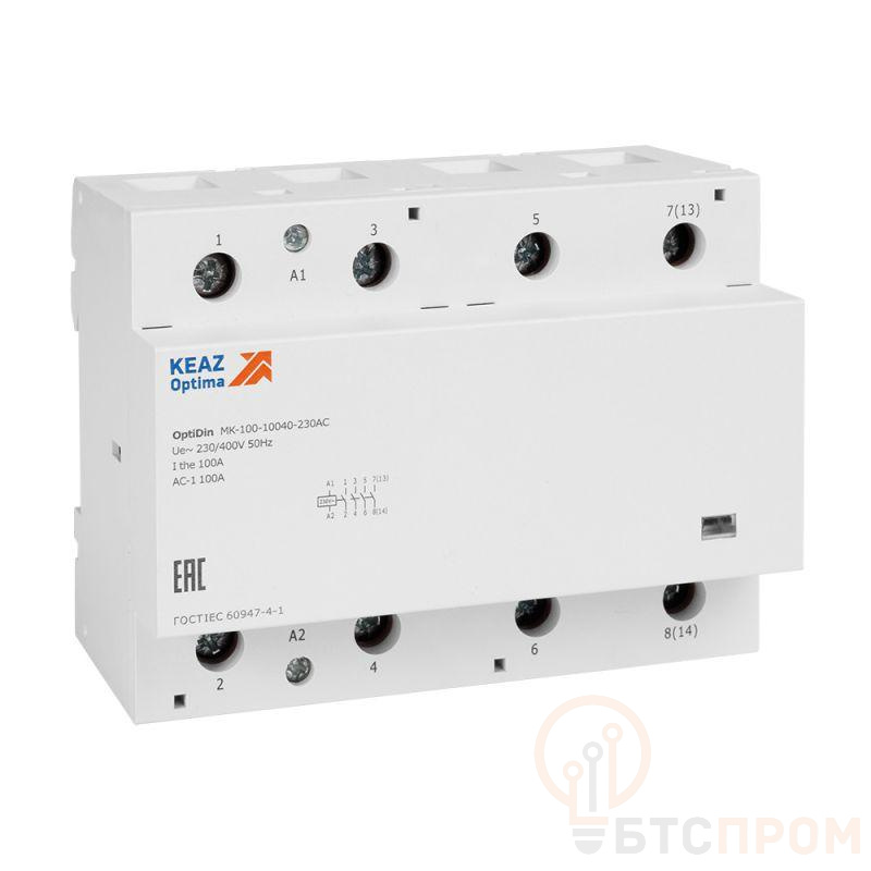 Модульный контактор на номинальный ток 100 А габаритом 6 модулей с контактной группой 4 НО, 0 НЗ .