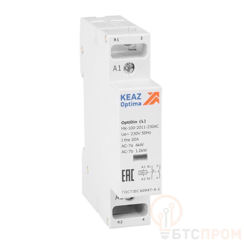 Модульный контактор OptiDin MK-100 (L) на номинальный ток 20 А габаритом 1 модуль с контактной группой 1 НО, 1 НЗ .