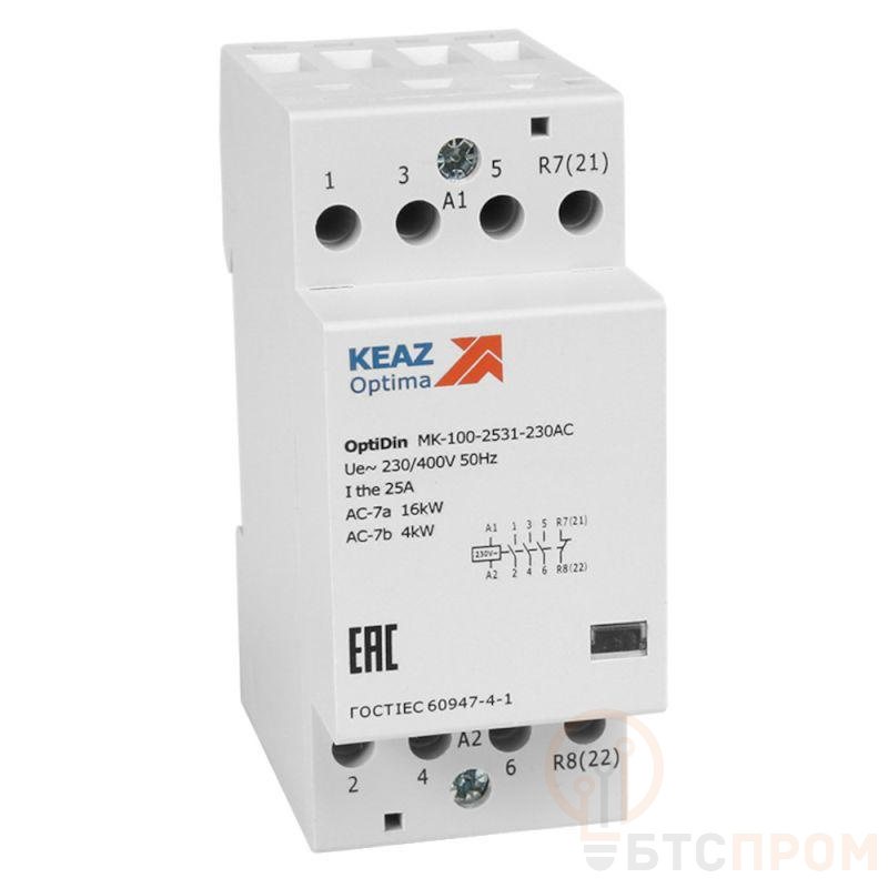 Модульный контактор на номинальный ток 25 А габаритом 2 модуля с контактной группой 0 НО, 4 НЗ .