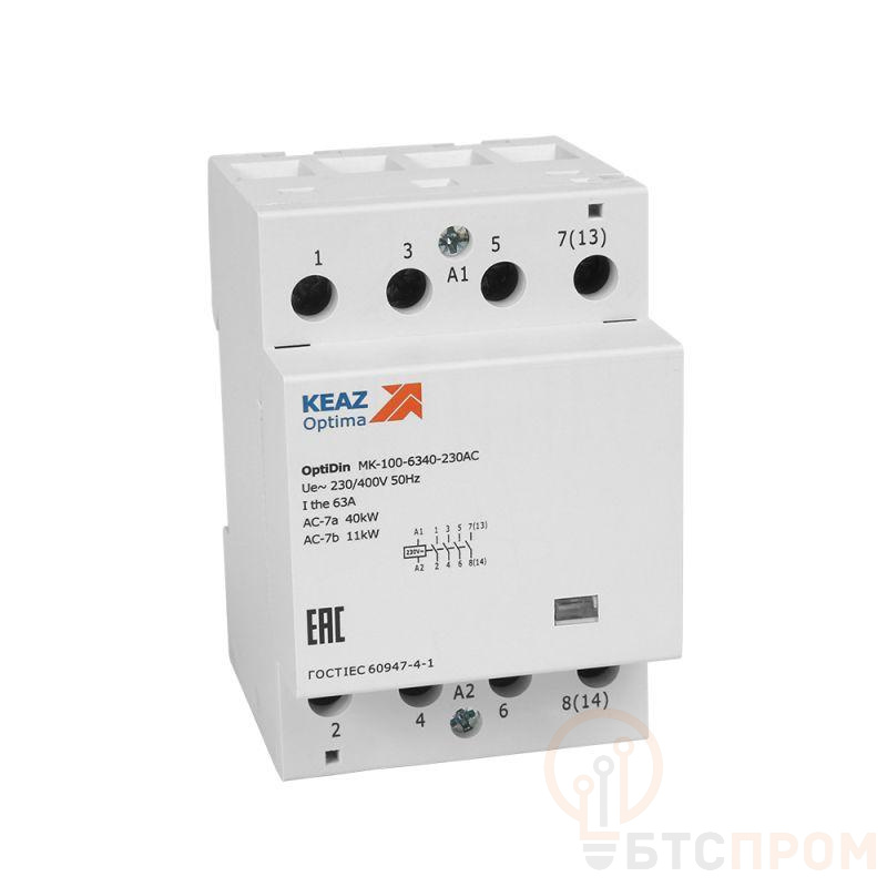 Модульный контактор на номинальный ток 63 А габаритом 2 модуля с контактной группой 2 НО, 0 НЗ .