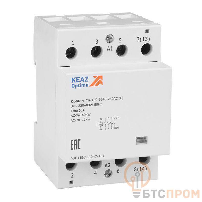 Модульный контактор OptiDin MK-100 (L) на номинальный ток 63 А габаритом 3 модуля с контактной группой 4 НО, 0 НЗ .