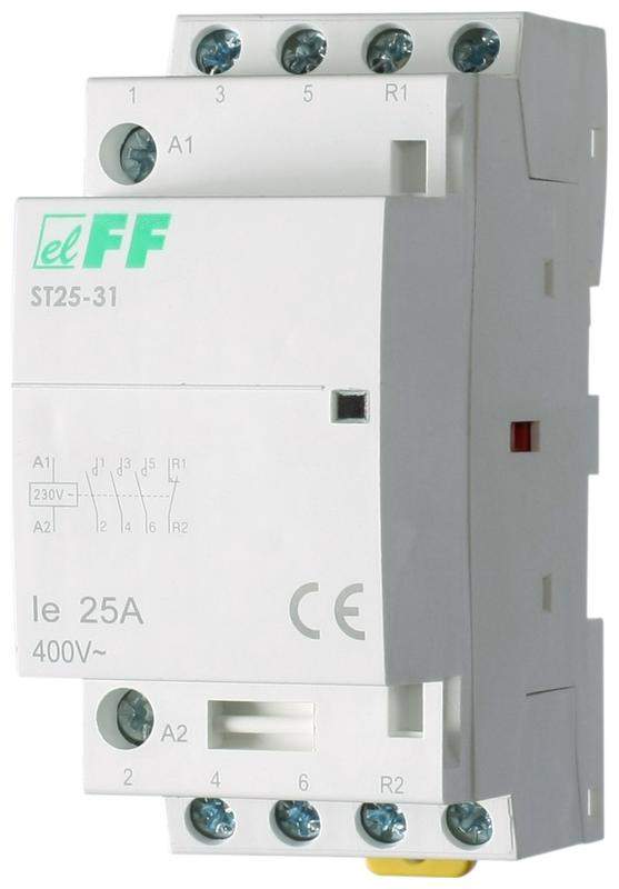 Контактор серии "ST" Монтаж на DIN-рейку. Предназначены для частого дистанционного включение и выключение электрических цепей повышенной мощности при нормальных условиях работы. Подача напряжения питания на катушку контактора приводит к переключению контактов. Рабочее состояние контактора сигнализируется поднятым красным флажком на лицевой панели. После отключения напряжения питания, контакты возвращаются в своё первоначальное положение. Особенности контактора ST25-31: максимальный ток нагрузки - 25 А; контакты - 3NO+1NC;