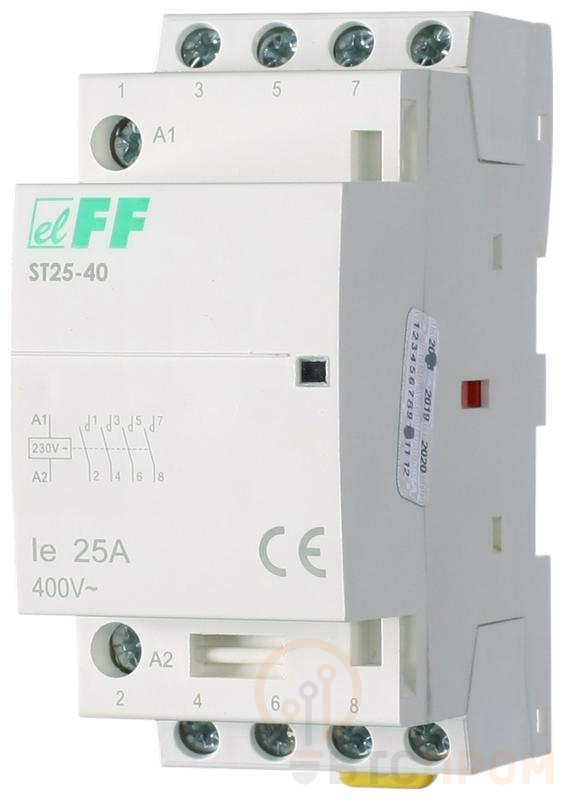Контактор серии "ST" Монтаж на DIN-рейку. Предназначены для частого дистанционного включение и выключение электрических цепей повышенной мощности при нормальных условиях работы. Подача напряжения питания на катушку контактора приводит к переключению контактов. Рабочее состояние контактора сигнализируется поднятым красным флажком на лицевой панели. После отключения напряжения питания, контакты возвращаются в своё первоначальное положение. Особенности контактора ST25-40/24: максимальный ток нагрузки - 25 А; контакты - 4NO; нпаряжение питания - 24V AC
