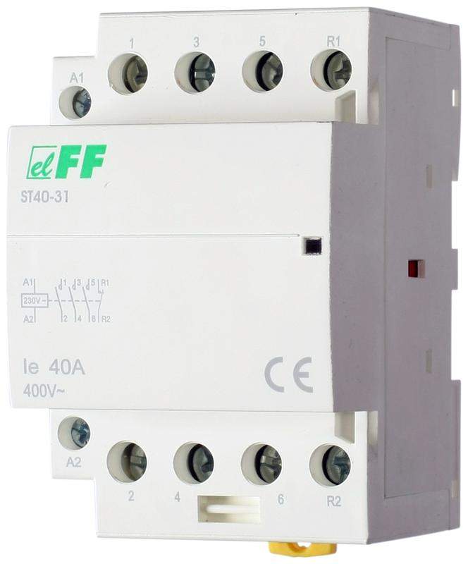 Контактор серии "ST" Монтаж на DIN-рейку. Предназначены для частого дистанционного включение и выключение электрических цепей повышенной мощности при нормальных условиях работы. Подача напряжения питания на катушку контактора приводит к переключению контактов. Рабочее состояние контактора сигнализируется поднятым красным флажком на лицевой панели. После отключения напряжения питания, контакты возвращаются в своё первоначальное положение. Особенности контактора ST40-31: максимальный ток нагрузки - 40 А; контакты - 3NO+1NC;