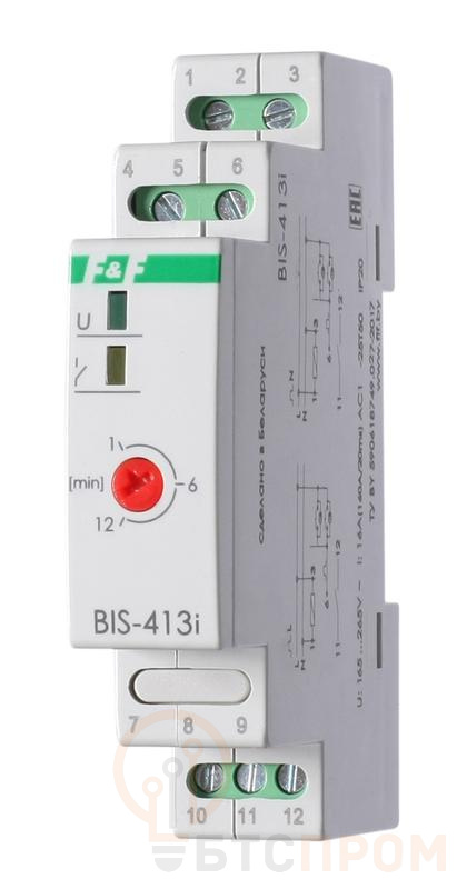 Реле импульсное бистабильное серии "BIS" Монтаж на DIN-рейку. Предназначено для управления одной нагрузкой, включение/выключение освещения, электроустановки и т.п. из нескольких мест выключателями кнопочного типа, параллельно соединенными между собой. Таймер времени реле обеспечивает выключение нагрузки через настраиваемый интервал времени в диапазоне от 1 до 12 минут. Принцип работы Включение нагрузки осуществляется подачей электрического импульса на вход управления реле замыканием любого из выключателей кнопочного типа, параллельно соединенных между собой. Выключение нагрузки произойдёт после очередного замыкания одного из выключателей, либо по окончании времени выключения, установленного переключателем на корпусе реле в интервале от 1 до 12 минут. Особенности: таймер времени с настраиваемой задержкой выключения в интервале от 1 до 12 минут; гальваническая развязка между исполнительными реле (сухой контакт) и цепью питания; нет памяти контактов; возможно подключение выключателей кнопочного типа с подсветкой; для LED освещения, кратковременная коммутация нагрузки с большим пусковым током (120А/20мс); максимальный ток нагрузки 16 А.