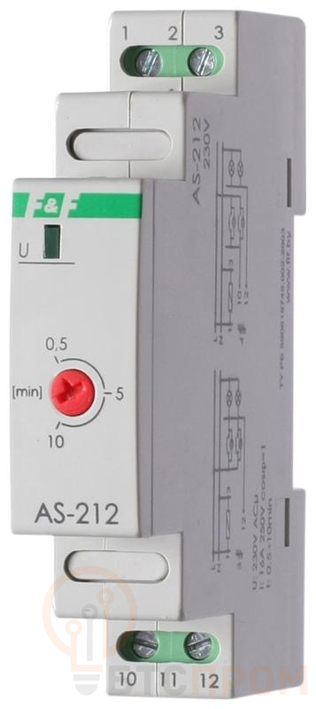 Автомат лестничный серии "AS" Монтаж на DIN-рейку. Для включения освещения и автоматического выключения через заданный промежуток времени. Принцип работы. После включения освещения и истечении заданной выдержки времени работы реле отключает освещение. Выдержка времени устанавливается потенциометром на передней панели реле. Лестничный автомат не реагирует на повторное нажатие выключателя во время отсчёта выдержки времени. Возможно управление выключателями с неоновой подсветкой (выключатели без фиксации, кнопочного типа). Особенности: задержка выключения 0,5-10 мин; напряжение питания - 230 В AC; максимальный ток нагрузки - 16 А; контакт - 1NO.