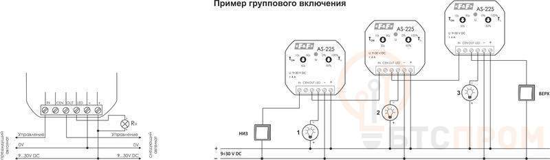 Автомат лестничный серии "AS" В монтажную коробку. Предназначен для построения многоточечного каскадного управления освещением, например, эффекта "бегущего света" вдоль лестницы. Принцип работы. Короткое нажатие кнопки приведет к включению освещения. По истечении настраиваемого интервала времени в пределах от 10-90 секунд освещение плавно погаснет. Возможно управление выключателями с неоновой подсветкой (выключатели без фиксации, кнопочного типа). Особенности: длительность включения освещения в интервале от 10-90 сек; задержка отключения 0-100% от длительности включения освещения; напряжение питания - 9-30 В DC; максимальный ток нагрузки - 4 А; выход транзисторный (открытый коллектор).