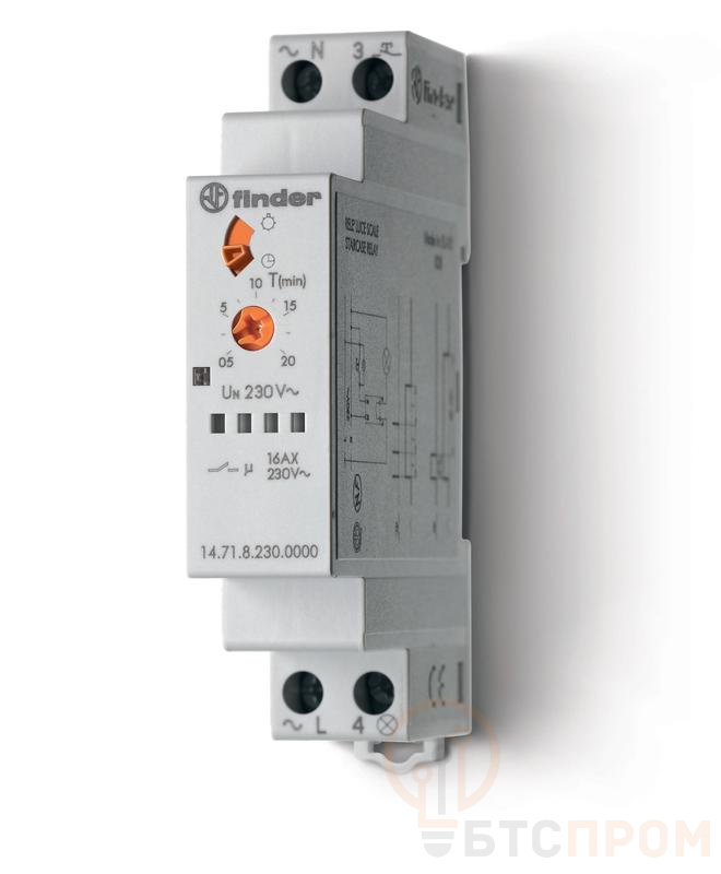 Таймер модульный электронный лестничный 1-функциональный 1NO 16А 3- или 4-проводная схема 230В AC 17.5мм IP20 FINDER 147182300000