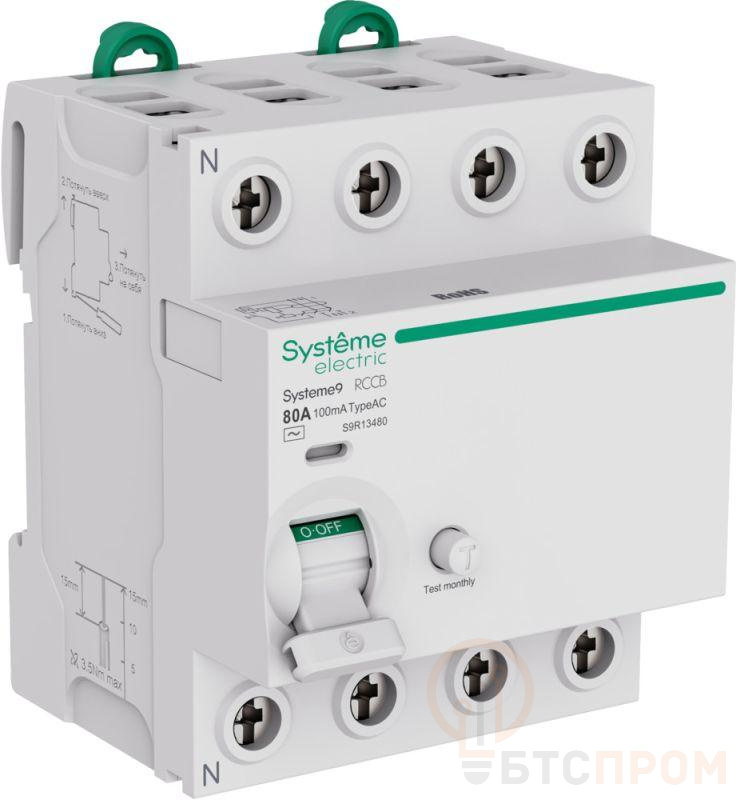 Выключатель дифференциального тока (ВДТ) или устройство защитного отключения (УЗО) S9R, серии Systeme9, Systeme Electric, 4-полюсный, номинальный ток 80 А, ток утечки = 100 мА, тип AC. Соответствует требованиям стандартов ГОСТ IEC 61008-1 и ГОСТ IEC 60947-2. Применяется в электрических сетях напряжением 400 В. Предназначен для защиты людей от токов утечки при прямом (10 и 30мА) и косвенном (100мА) прикосновении к токоведущим частям, а также для защиты электроустановок от возгорания (300мА). Принцип действия - электромеханический. Нейтраль слева. Оснащен двойными безопасными клеммами раздельного монтажа проводников, механизмом мгновенной коммутации, индикатором состояния контактной группы и срабатывания по причине возникновения тока утечки. Монтируется на DIN-рейку при помощи двухпозиционных защёлок, с возможностью демонтажа без снятия шины PIN.