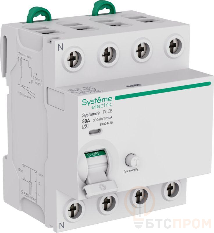 Выключатель дифференциального тока (ВДТ) или устройство защитного отключения (УЗО) S9R, серии Systeme9, Systeme Electric, 4-полюсный, номинальный ток 80 А, ток утечки = 300 мА, тип A. Соответствует требованиям стандартов ГОСТ IEC 61008-1 и ГОСТ IEC 60947-2. Применяется в электрических сетях напряжением 400 В. Предназначен для защиты людей от токов утечки при прямом (10 и 30мА) и косвенном (100мА) прикосновении к токоведущим частям, а также для защиты электроустановок от возгорания (300мА). Принцип действия - электромеханический. Нейтраль слева. Оснащен двойными безопасными клеммами раздельного монтажа проводников, механизмом мгновенной коммутации, индикатором состояния контактной группы и срабатывания по причине возникновения тока утечки. Монтируется на DIN-рейку при помощи двухпозиционных защёлок, с возможностью демонтажа без снятия шины PIN.